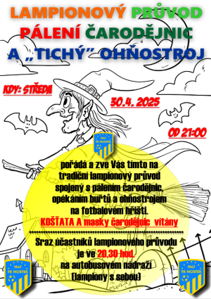 Fotbalový klub Mostek vás zve na tradiční lampionový průvod spojený s pálením čarodějnic, opékáním buřtů a speciálním „tichým” ohňostrojem. Akce se koná 30. dubna 2025 od 21:00 hodin na fotbalovém hřišti. Sraz účastníků je ve 20:30 hodin na autobusovém nádraží, lampiony s sebou!