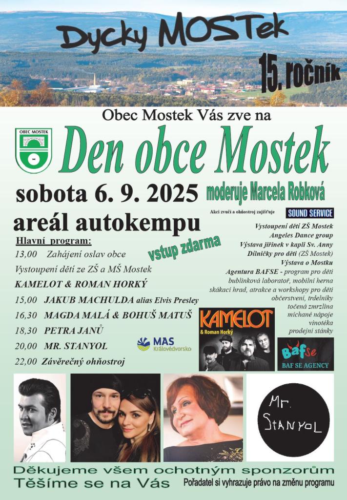 Oslavy obce Mostek začnou ve 13:00 hodin a nabídnou pestrý program pro všechny generace. Vystoupení dětí ze ZŠ a MŠ Mostek, Angeles Dance Group, koncerty známých umělců jako KAMELOT & Roman Horký, Jakub Machulda alias Elvis Presley, Magda Malá & Bohuš Matuš, Petra Janů a Mr. Stanyol. Na závěr se můžete těšit na ohňostroj. Pro děti jsou připraveny dílničky, skákací hrad a program od agentury BAFSE.
