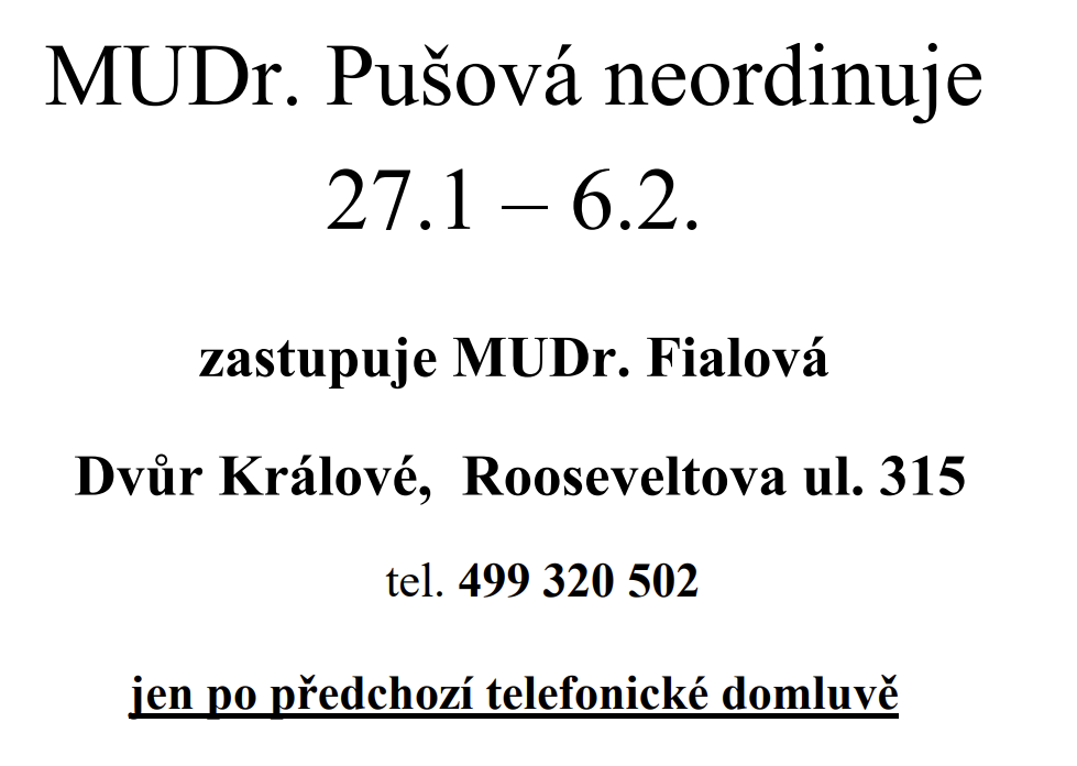 MUDr. Pušová oznamuje přerušení ordinace od 27. ledna do 6. února 2026