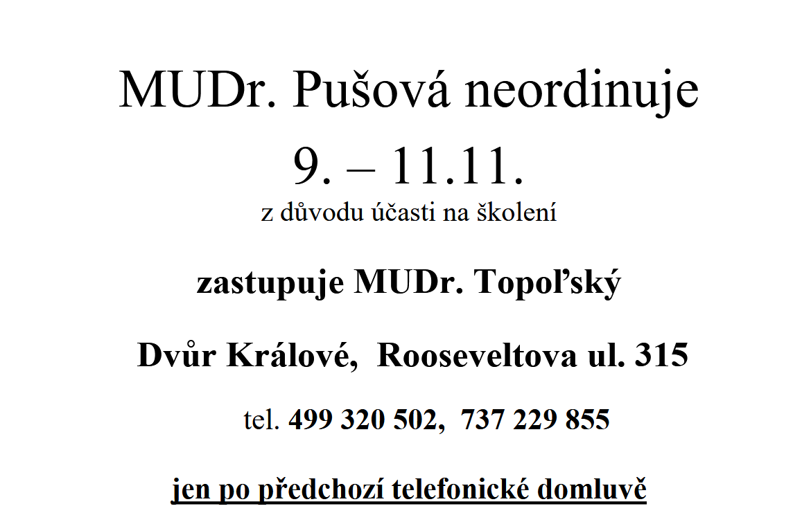 MUDr. Pušová oznamuje, že od 9. 11. do 11. 11. 2022 neordinuje.