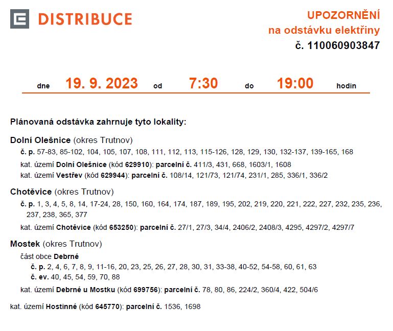 ČEZ Distribuce oznamuje plánovanou odstávku dne 19.9.2023 od 7:30 do 19:00 hodin v lokalitě Mostek - část Debrné.