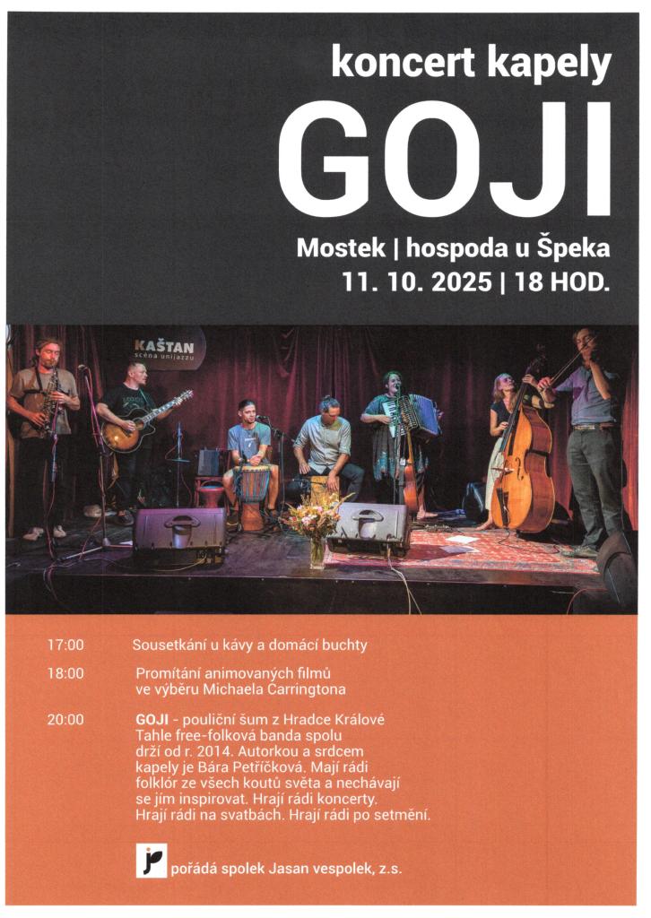 Spolek Jasan vespolek, z.s. pořádá 11. 10. 2025 od 17 hodin v restauraci u Špeka sousetkání u kávy, promítání animovaných filmů a koncert kapely GOJI.